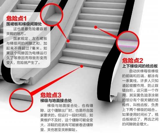 而今年的3月9日8時許,白云區萬達百貨商場內一處手扶電梯出現傷人事故,一位小男孩的五個腳趾被手扶電梯電梯盡頭的夾板夾斷。