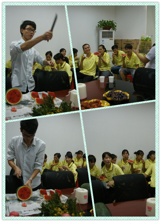 不一會(huì)兒,我們的同事就分工合作了,忙碌著將這些水果飲料之類的送到我們可愛的同事手里。有一個(gè)同事還瞬間表演起了“真人版切西瓜”,這陣勢(shì)可非一般哦。