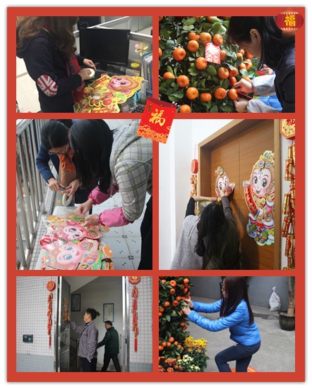 接下來就是遵循我們優秀的傳統習俗貼春聯啦。春聯,起源于桃符,據說五代時的后蜀國國君孟昶在公元964年歲尾的除夕,他突發奇想手下的一個叫辛寅遜的學士,在桃木板上寫了兩句話掛在他的住室的門框上。這兩句話是“新年納余慶,嘉節號長春”,大意是:新年享受著先代的遺澤,佳節預示著春意常在。這是我國的第一副春聯,春聯寓意既是辟邪驅災,也是祈福祝愿。大家互相幫忙,各自分工,有些同事幫忙沾膠水,有些同事幫忙貼,很快就貼好了。貼完后,紅色的春聯特別喜慶,到處洋溢著節日的氣氛,大家整理好手頭的工作,就好好回家與家人團聚,過大年了。