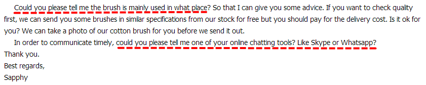 剛開始只有客戶的一個郵箱,我想著要快速給客戶解決問題,只通過郵件溝通還是很費時間,于是給客戶發的第一封郵件除了問客戶想要什么清潔毛刷?用于哪里等問題,也問他要在線聊天工具或電話。這樣能更加直接、快速的了解到客戶的需求,給客戶寄相應的樣品,從而給出使用方案。(下圖是我發的第一封郵件)